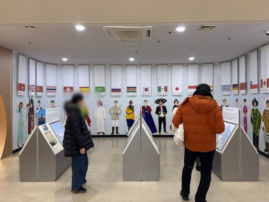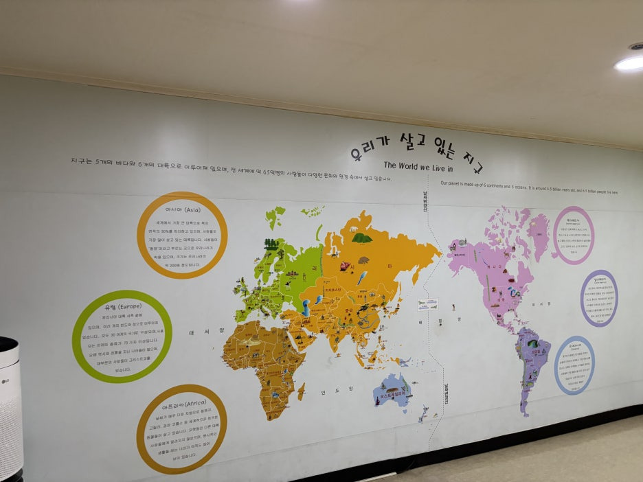 그리고 세계지도와 함께 세계각국의 문화 인형 등 알 수 있는 물품들이 전시 되어있어요.